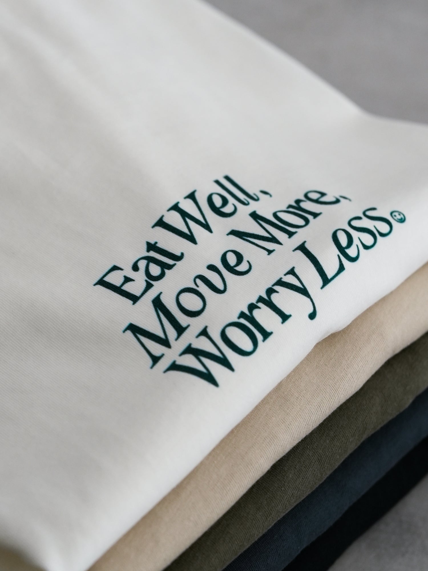 Eat Well, Move More, Worry Less T-Shirt (Front Print, Khaki)